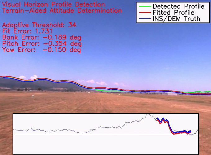 A video is available of the terrain-aided attitude determination algorithm operating on a test flight video by clicking on the image below. The extracted horizon profile is matched to the terrain-aided horizon profile to accurately estimate the bank, pitch and yaw of the aircraft.