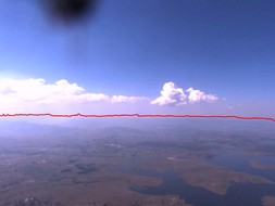 A video is available of the terrain-aided localisation and attitude determination algorithm operating on a simulated video by clicking on the image below. The extracted horizon profile is matched to the terrain-aided horizon profile to estimate attitude and position of the aircraft.